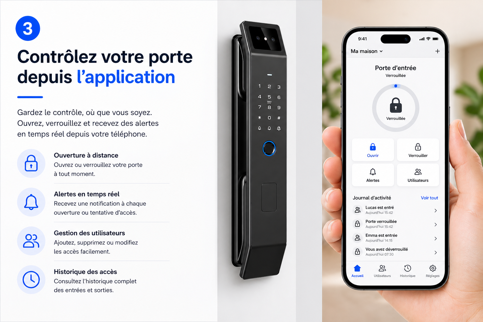 Oubliez les clés perdues, les accès compliqués et le stress. Contrôlez votre porte en un instant, où que vous soyez.