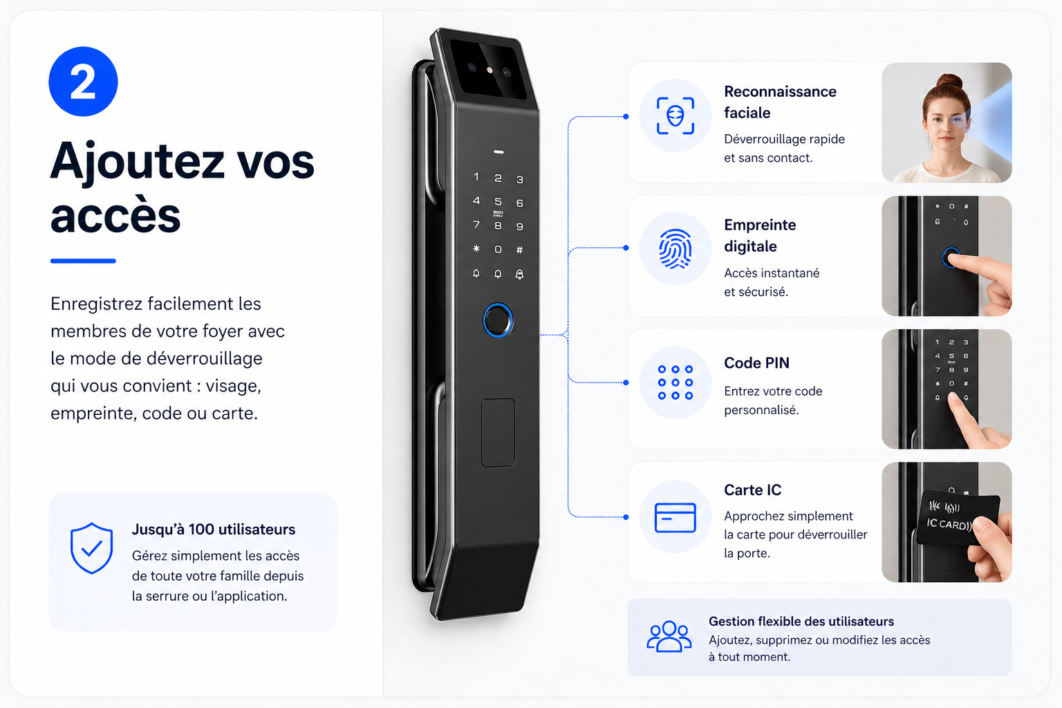 Ajoutez votre visage, empreintes,codes ou accès mobile en quelques secondes. Partagez l'accès en toute sécurité.